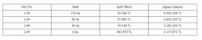 5 milyon liralık bir konut aldığımızı düşünelim, 2 milyonu için yüzde 2,49 faizle, 120 ay, 80 ay, 40 ay ve 6 aylık geri ödemelerle yapılacak ödemelere ait senaryolar şöyle: