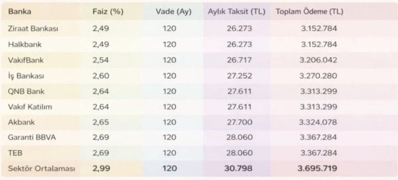 Aylık yüzde 2,99 faiz oranıyla 120 ay vadeli kullanılan 1 milyon TL’lik konut kredisinde aylık taksit 30 bin 798 TL olurken, toplam geri ödeme 3 milyon 695 bin TL seviyesinde gerçekleşiyor.