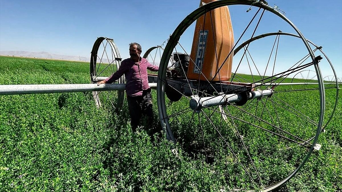 "Yağmurlamada 4-5 kişi olması lazım. Yonca tarlasında çamur içinde yürümek de zor olduğu için uzun sürüyordu. Bu sistemde kendi başıma geceli gündüzlü 4 günde sulamayı bitiriyorum. Mahsul de fazla susamıyor. Belirli aralıklarla büyük tekerlerin olduğu, 360 metre uzunluğundaki hat üzerinde 50 fıskiye var. Bu hattı, ortadaki benzinli motor ileri geri hareket ettiriyor."
