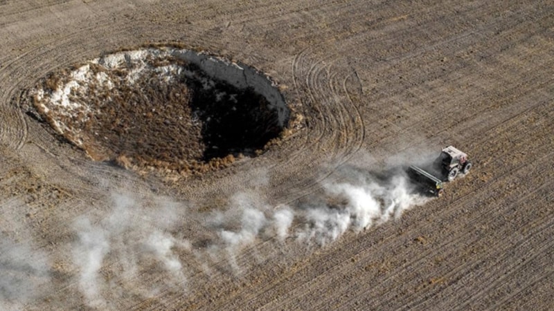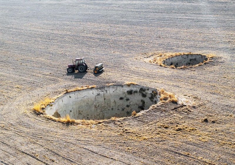 Konya'nın Karapınar ilçesinde, son 10 yılda çeşitli çap ve derinlikteki 8 obruğun oluştuğu 100 dekarlık tarlada hububat ekimi, tüm tehlike ve zorluklara rağmen yapıldı.