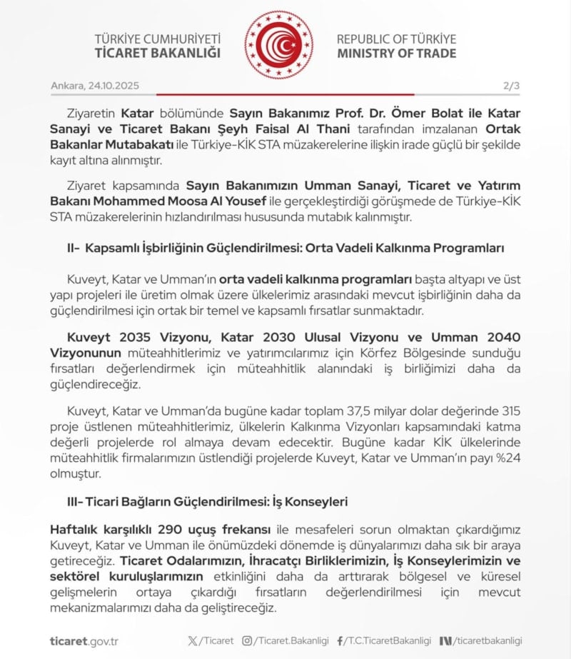 Açıklamada, Bolat ile Katar Sanayi ve Ticaret Bakanı Şeyh Faysal bin Sani Al Sani tarafından imzalanan "Ortak Bakanlar Mutabakatı" ile Türkiye-KİK STA müzakerelerine ilişkin iradenin güçlü şekilde kayıt altına alındığı, Umman Sanayi, Ticaret ve Yatırım Teşvik Bakanı Qais Mohammed Moosa Al Yousef ile gerçekleştirdiği görüşmede de Türkiye-KİK STA müzakerelerinin hızlandırılması hususunda mutabık kalındığı vurgulandı.
