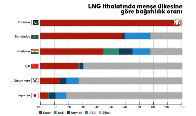 Gerçek zamanlı veri analitik şirketi Kpler'in verilerine göre, Hindistan, LNG ihtiyacının yaklaşık yüzde 50'sini Katar'dan karşılıyor. Çin, ithalatının yüzde 30'unu bu bölgeden sağlıyor. Pakistan ise LNG ihtiyacının yüzde 99'unu Katar ile yapılan uzun vadeli kontratlarla yönetiyor.