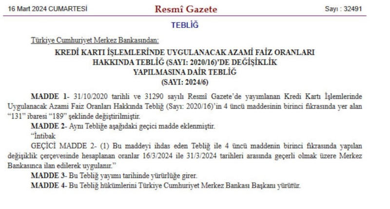 TCMB'nin Kredi Kartı İşlemlerinde Uygulanacak Azami Faiz Oranları Hakkında Tebliğ'de Değişiklik Yapılmasına Dair Tebliği, Resmi Gazete'de yayınlandı.