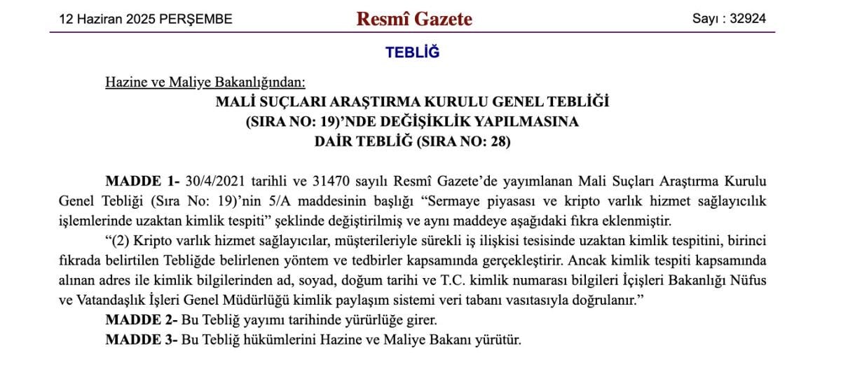 Hazine ve Maliye Bakanlığı'nın Resmi Gazete'nin bugünkü sayısında yayımlanan ve Mali Suçları Araştırma Kurulu (MASAK) genel tebliğinde değişiklik yapan tebliğe göre, kripto varlık hizmet sağlayıcıları, müşterileriyle sürekli iş ilişkisi tesisinde uzaktan kimlik tespitini, bu tebliğde belirlenen yöntem ve tedbirler kapsamında gerçekleştirecek.