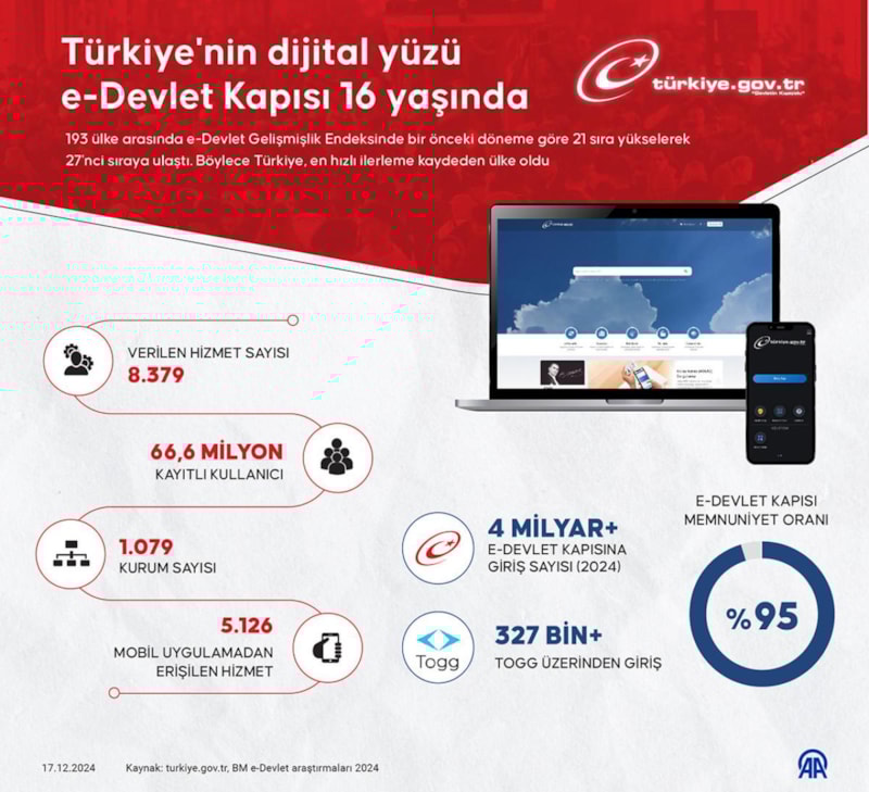 18 Aralık 2008'de erişime açılan e-Devlet Kapısı'nın 16 yıl sonucunda kullanıcı sayısı 66,6 milyona ulaştı. E-Devlet'te şu anda 1.079 farklı kuruma ait toplam 8 bin 379 dijital hizmet sunuluyor.