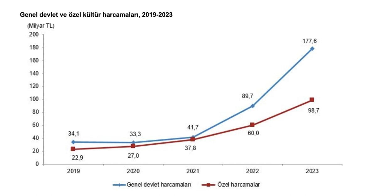 Kültür harcamaları 2023 yılında 2022 yılına göre yüzde 84,7 artarak 276 milyar 338 milyon 253 bin TL olurken, gayrisafi yurt içi hasılaya oranı 2023 yılında yüzde 1 olarak gerçekleşti.