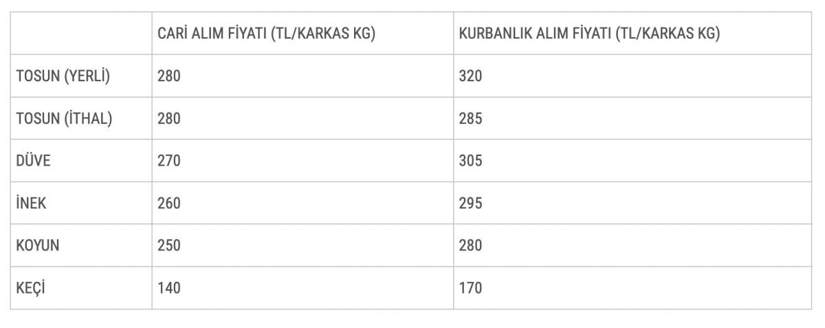 Büyükbaş kurbanlık alım fiyatları ise kilogram başına yerli tosunda 320 lira, ithal tosunda 285 lira, düvede 305 lira ve inekte 295 lira olarak uygulanacak.