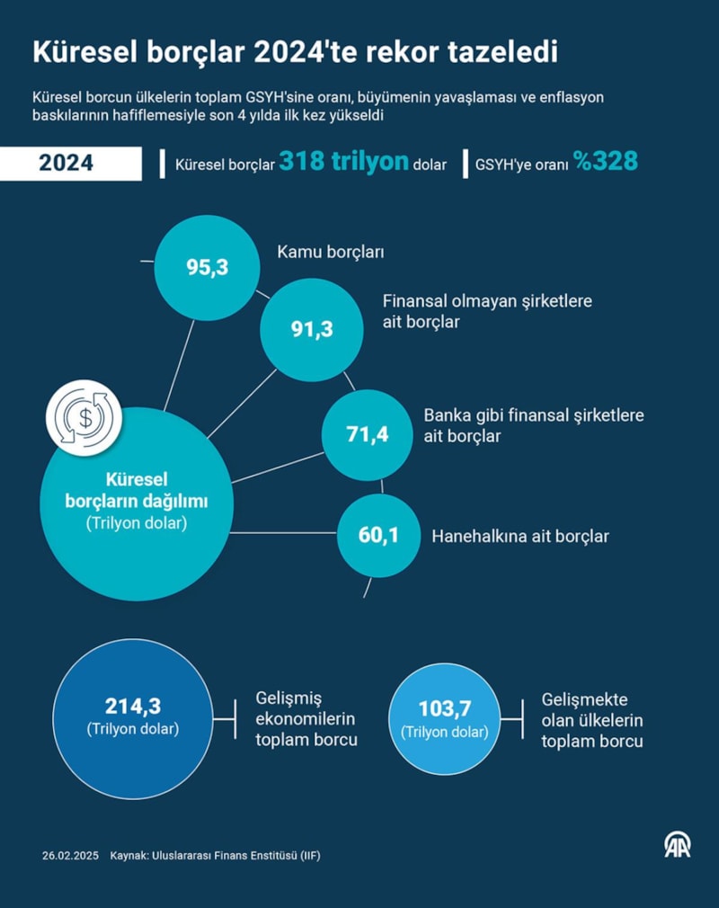Rapora göre, küresel borç tutarı 2024 yılında yaklaşık 7 trilyon dolar artışla 318 trilyon dolara ulaşarak rekor tazeledi.