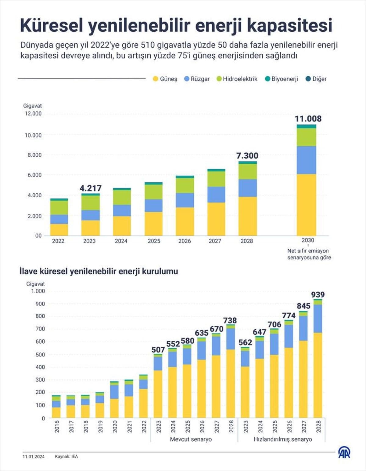 İklim değişikliğiyle mücadelenin yanı sıra ülkelerin enerji arz güvenliğinde kritik rol oynayan yenilenebilir enerjide büyümenin giderek hızlanacağı öngörülürken, 2028'e kadar dünyanın yenilenebilir enerji kapasitesinin 7 bin 300 gigavata ulaşacağı hesaplanıyor.