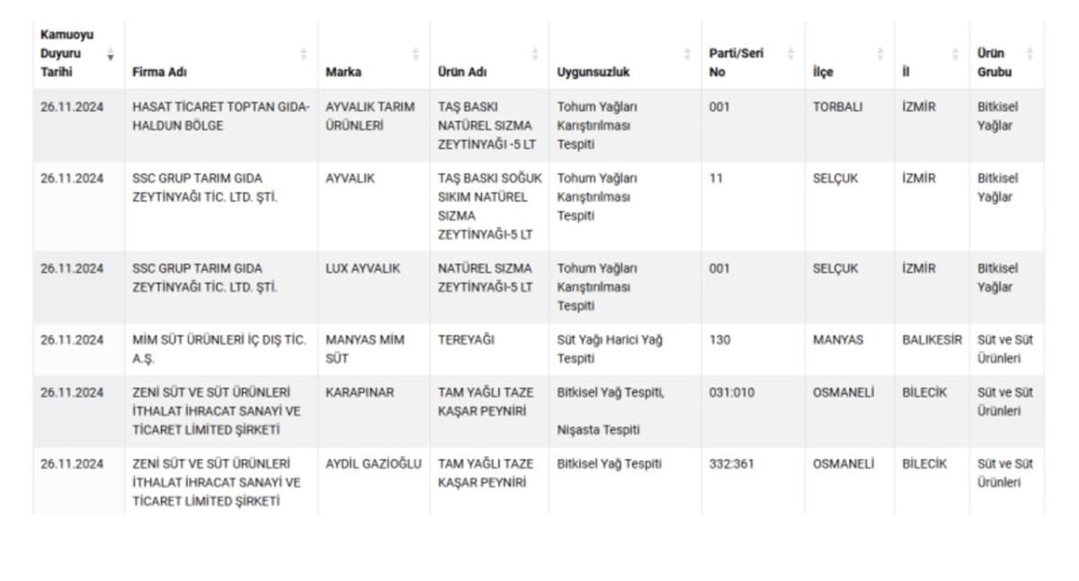 Taklit veya Tağşiş Yapılan Gıdalar listesindeki sayı son katılan 5 firma ile 771'e yükseldi. Firmalar İzmir Balıkesir ve Belicik illerinden listeye girdi. Bu kez de zeytinyağına tohum yağı karıştırıldı, tereyağına süt yağı haricinde yağ karıştırıldı, tam yağlı taze kaşar peynirine bitkisel yağ ve nişasta tespiti yapıldı.