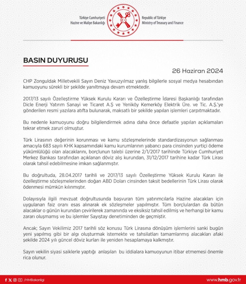 Bakanlık, Yavuzyılmaz'ın Dicle Enerji Yatırım Sanayi ve Ticaret A.Ş (DEDAŞ) ve Yeniköy Kemerköy Elektrik Üre. ve Tic. A.Ş.'ye gönderilen resmi yazılara atıfta bulunarak, geçmişe dönük kur hesabının kamu zararı doğurduğu iddialarının gerçeği yansıtmadığını belirterek, gerçek uygulamayı anlatan bir açıklama yaptı.