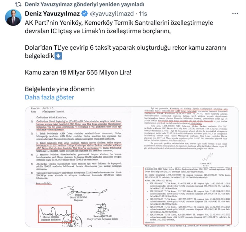 Sosyal medya hesabından paylaşım yapan Yavuzyılmaz, bu nedenle oluşan kamu zararının 2 milyar 498 milyon TL olduğunu vurgularken 2017'de alınan kararın altında dönemin Başbakan Yardımcısı ve mevcut Hazine ve Maliye Bakanı Mehmet Şimşek'in imzasının bulunduğunu da aktarmıştı.