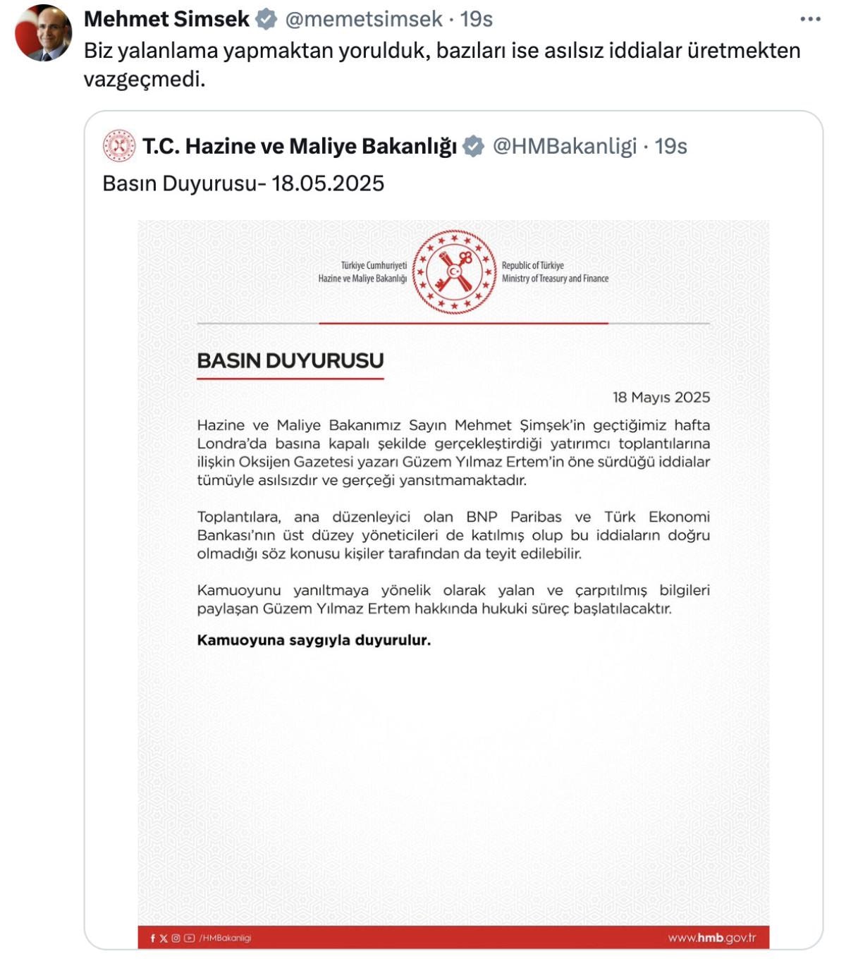 Öte yandan, Bakan Şimşek de Bakanlığın açıklamasını alıntılayarak, "Biz yalanlama yapmaktan yorulduk, bazıları ise asılsız iddialar üretmekten vazgeçmedi." paylaşımında bulundu.