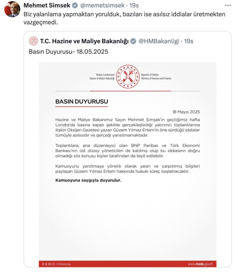 Hazine ve Maliye Bakanlığı'ndan Londra'daki yatırımcı toplantılarına ilişkin iddialar hakkında açıklama yapıldı. Hazine ve Maliye Bakanı Şimşek, da asılsız iddialarla ilgili yorum yaptı.