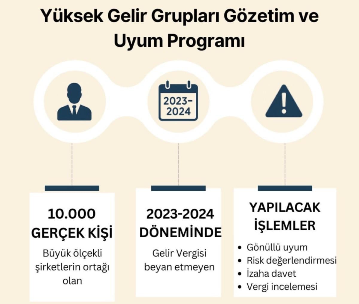 Paylaşımda, "Büyük şirket ortağı olup, 2023-2024 döneminde Gelir Vergisi beyannamesi vermemiş, potansiyel gelir ve harcama düzeyi ile vergi beyanları uyumsuz olan 10 bin mükellef 'Yüksek Gelir Grupları Gözetim ve Uyum Programı' kapsamına alınmıştır." ifadeleri kullanıldı.