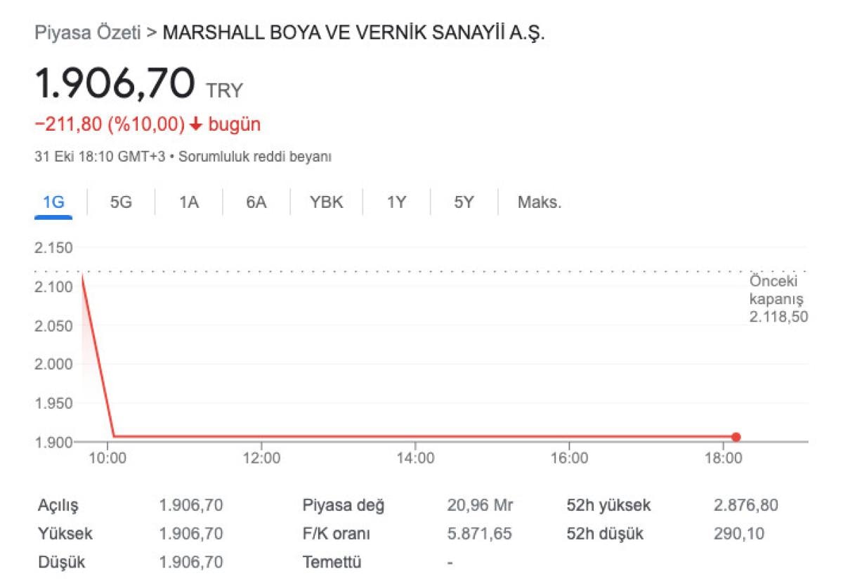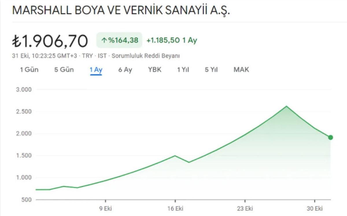Marshall Boya hisse senedi 27 Eylül tarihli seansta 640 lirayken, 30 günde 2 bin 870 liraya kadar yükseldi.
