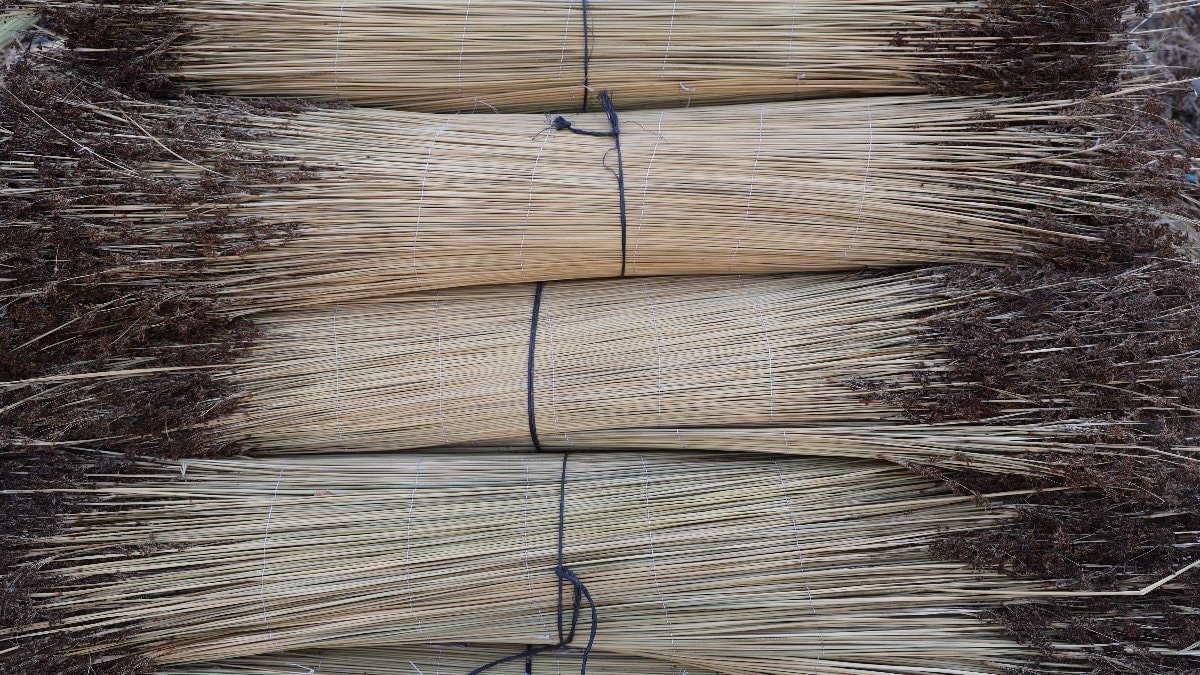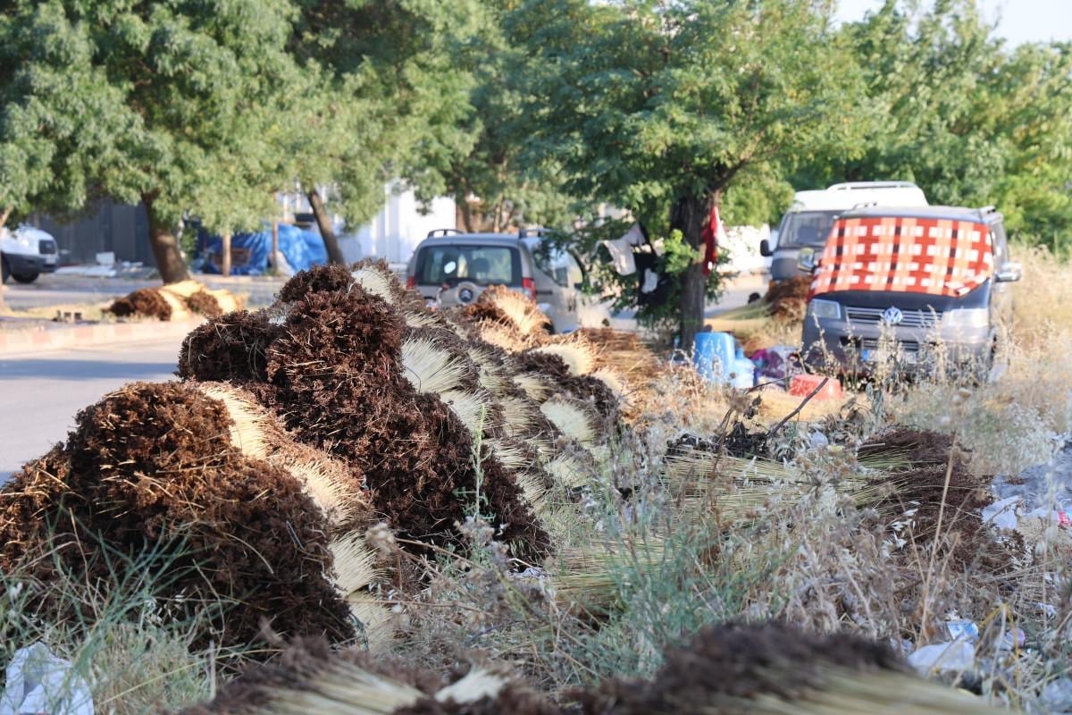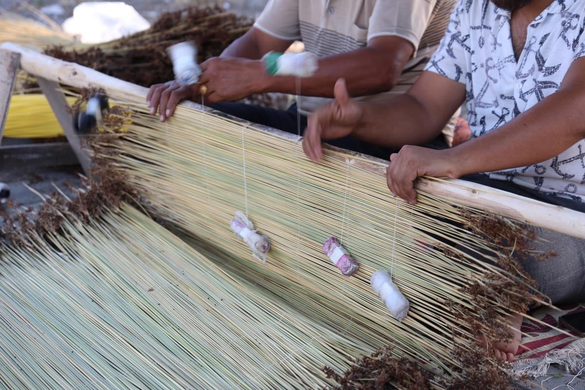 Adana ve Osmaniye bölgelerinde toplanan çığ çubukları, kurutulduktan sonra oluşturulan tezgahta ip yardımıyla tek tek diziliyor.