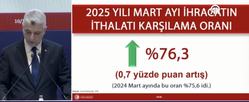 Bolat'ın verdiği bilgilere göre, martta dış ticaret açığı 7,3 milyar dolar, yıllık bazda yüzde 3,2'lik artış var, mart ayıyla birlikte son 22 ayın 13'ünde aylık ihracat rekoru kırılmış oldu.