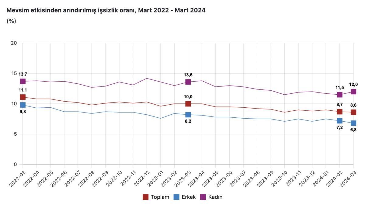 Şubat ayında mevsim etkisinden arındırılmış işsizlik oranı yüzde 8,7 seviyesinde gerçekleşmişti.