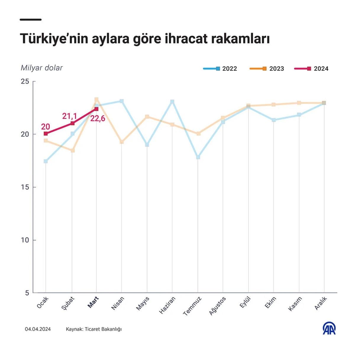 2024 yılı Mart ayında ihracat 22 milyar 578 milyon dolar olarak gerçekleşmiştir. Mart ayı rakamı, 2024 Ocak ayındaki 20 milyar dolar ve şubat ayındaki 21,1 milyar doların üzerinde gerçekleşerek, mart ayında ihracatın aylık artışının devam ettiğini göstermektedir.