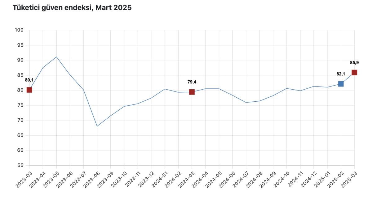 Türkiye İstatistik Kurumu (TÜİK) ve Türkiye Cumhuriyet Merkez Bankası (TCMB) iş birliği ile yürütülen tüketici eğilim anketi sonuçlarından hesaplanan tüketici güven endeksi, Şubat ayında 82,1 iken Mart ayında yüzde 4,6 oranında artarak 85,9 oldu.