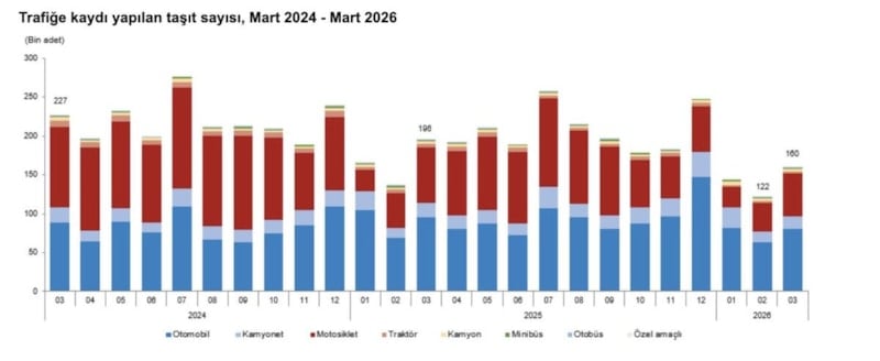 Mart ayında 159 bin 931 adet taşıtın trafiğe kaydı yapıldı. Mart ayında trafiğe kaydı yapılan taşıtların yüzde 50,2'sini otomobil, yüzde 34,8'ini motosiklet, yüzde 10,1'ini kamyonet, yüzde 1,7'sini kamyon, yüzde 1,6'sını traktör, yüzde 1,0'ını minibüs, yüzde 0,5'ini otobüs ve yüzde 0,1'ini özel amaçlı taşıtlar oluşturdu.