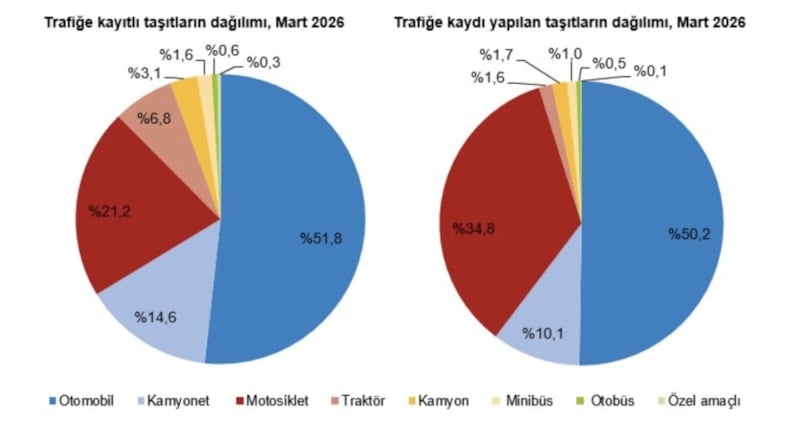 Mart ayında trafiğe kaydı yapılan taşıtların yüzde 50,2'sini otomobil, yüzde 34,8'ini motosiklet, yüzde 10,1'ini kamyonet, yüzde 1,7'sini kamyon, yüzde 1,6'sını traktör, yüzde 1,0'ını minibüs, yüzde 0,5'ini otobüs ve yüzde 0,1'ini özel amaçlı taşıtlar oluşturdu.