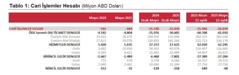 Buna göre mayıs ayında cari işlemler hesabı 684 milyon ABD doları açık kaydetti.