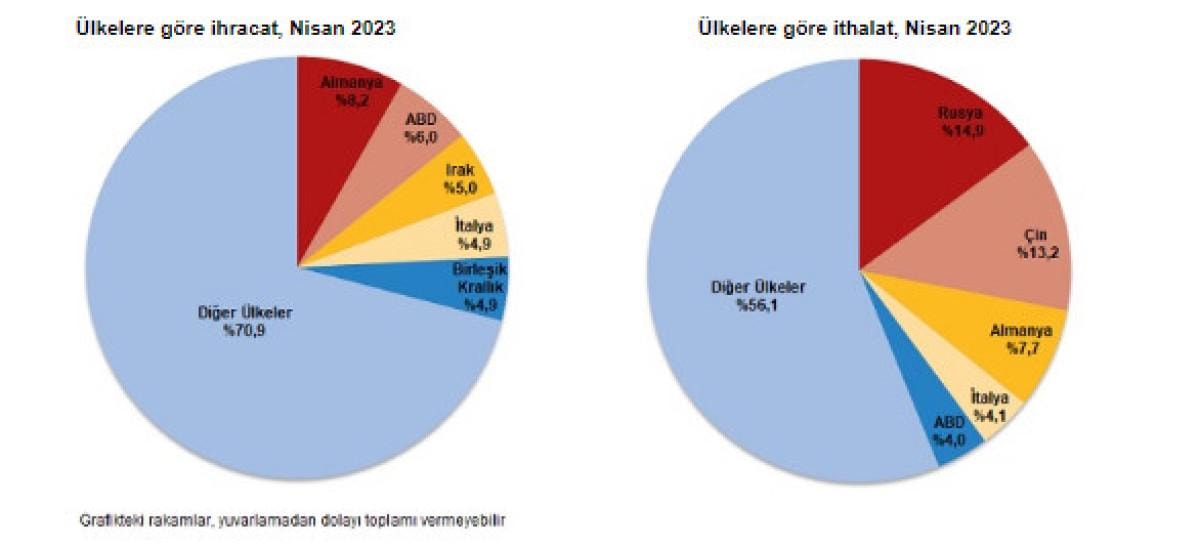 İthalatta Rusya Federasyonu ilk sırayı aldı. Nisan ayında Rusya Federasyonu'ndan yapılan ithalat 4 milyar 177 milyon dolar olurken, bu ülkeyi sırasıyla; 3 milyar 691 milyon dolar ile Çin, 2 milyar 175 milyon dolar ile Almanya, 1 milyar 153 milyon dolar ile İtalya, 1 milyar 117 milyon dolar ile ABD izledi. İlk 5 ülkeden yapılan ithalat, toplam ithalatın yüzde 43,9'unu oluşturdu.