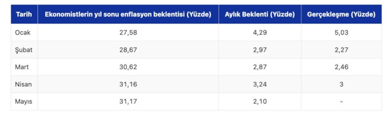 Öte yandan, ekonomistlerin 2025 sonu enflasyon beklentisi mayıs ayı itibarıyla yüzde 31,17 oldu.