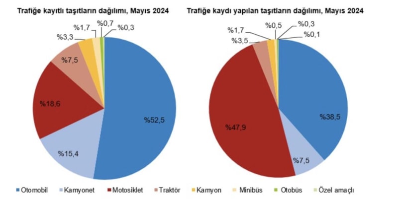 Mayıs ayında trafiğe kaydı yapılan taşıtların yüzde 47,9'unu motosiklet, yüzde 38,5'ini otomobil, yüzde 7,5'ini kamyonet, yüzde 3,5'ini traktör, yüzde 1,7'sini kamyon, yüzde 0,5'ini minibüs, yüzde 0,3'ünü otobüs ve yüzde 0,1'ini özel amaçlı taşıtlar oluşturdu.