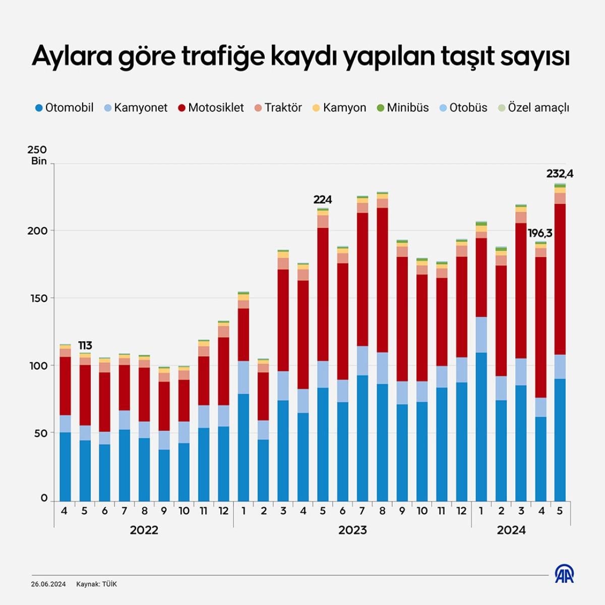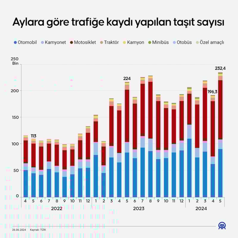 Türkiye İstatistik Kurumu (TÜİK) verilerine göre, mayıs ayında 232 bin 401 adet taşıtın trafiğe kaydı yapıldı.