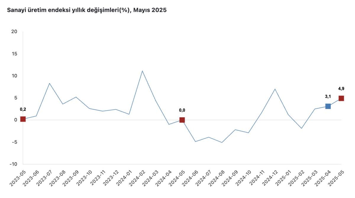 Buna göre, sanayi üretim endeksi mayısta aylık bazda yüzde 3,1, yıllık bazda yüzde 4,9 artış gösterdi.