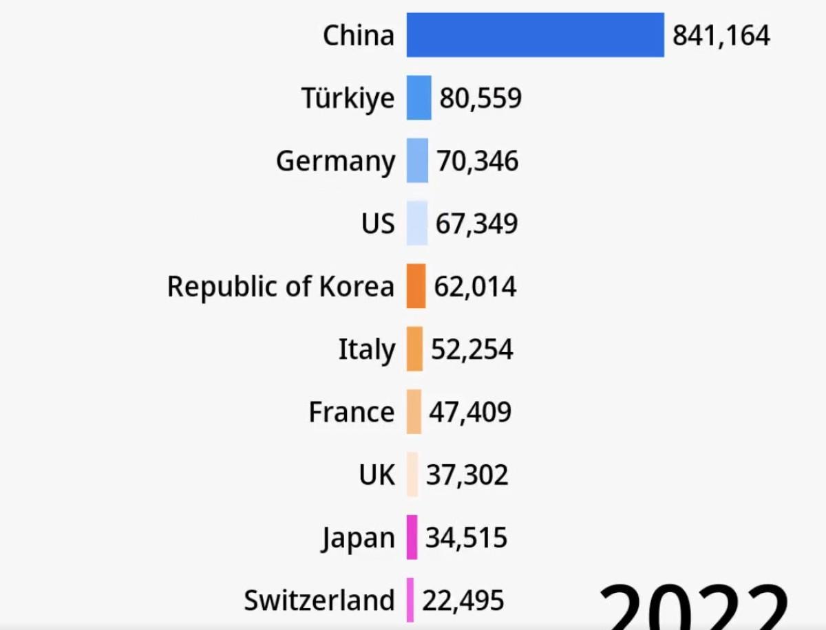 Çin başvuru sayısında dünya birincisi olarak göze çarpıyor. İkinci Türkiye ve listede üçüncü sırada Almanya bulunuyor.