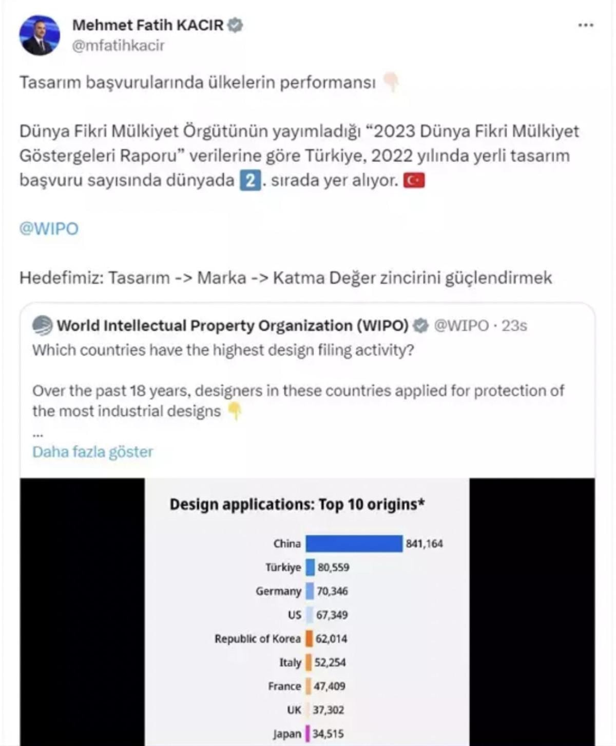 Bakan Kacır'ın Dünya Fikri Mülkiyet Örgütü'nü (WIPO) etiketlediği ve "Tasarım başvurularında ülkelerin performansı" başlıklı paylaşımı şöyle: