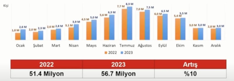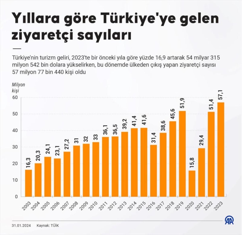 Türkiye için 2023, 54,3 milyar dolar turizm geliri ve 56,7 milyon ziyaretçi ile rekor yılı oldu.