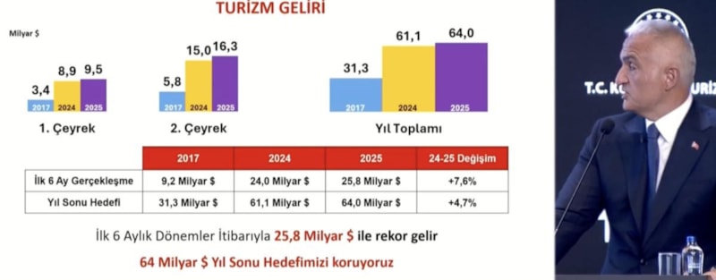 Bakan Ersoy, 2025'in ilk altı aylık gelirin yüzde 7,6 artışla 25,8 milyar dolarla rekor kırıldığını şöyle ilan etti: