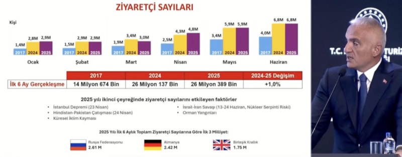 Kültür ve Turizm Bakanı Mehmet Nuri Ersoy, Türkiye'yi ocak-haziran ayları arasında gelen ziyaretçi sayısını ve 2025'in ilk altı aylık gelirin yüzde 7,6 artışla 25,8 milyar dolarla rekor kırdığını açıkladı.