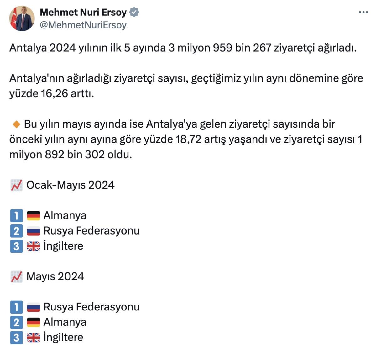 Bakan Ersoy, paylaşımında Ocak-Mayıs 2024 döneminde Antalya'ya en fazla ziyaretçi gönderen ülkeleri Almanya, Rusya Federasyonu ve İngiltere olarak sıraladı.