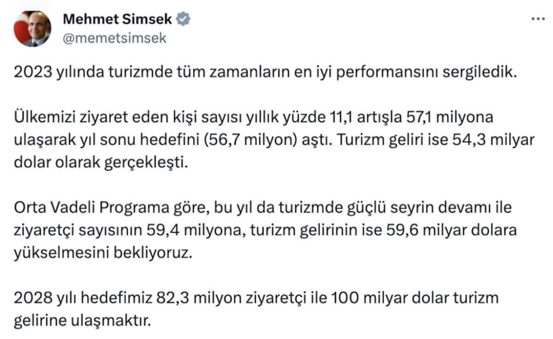 Hazine ve Maliye Bakanı Şimşek, Türkiye'nin 2023 yılındaki turizmdeki başarısını bir mesaj paylaşarak dile getirdi.