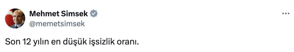 Hazine ve Maliye Bakanı Mehmet Şimşek, 2024 yılında yüzde 8,7 seviyesinde gerçekleşen işsizlik oranının, son 12 yılın en düşük işsizlik oranı olduğunu açıkladı.