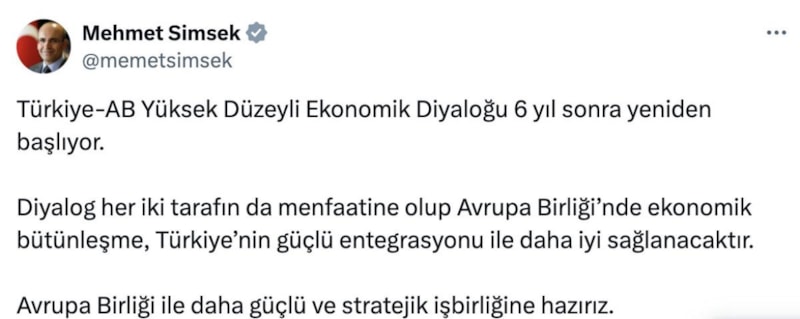 Bakan Mehmet Şimşek, bugün sosyal medya mesajında da "Türkiye-AB Yüksek Düzeyli Ekonomik Diyaloğu 6 yıl sonra yeniden başlıyor. Diyalog her iki tarafın da menfaatine olup Avrupa Birliği’nde ekonomik bütünleşme, Türkiye’nin güçlü entegrasyonu ile daha iyi sağlanacaktır. Avrupa Birliği ile daha güçlü ve stratejik iş birliğine hazırız." ifadelerini kullandı.