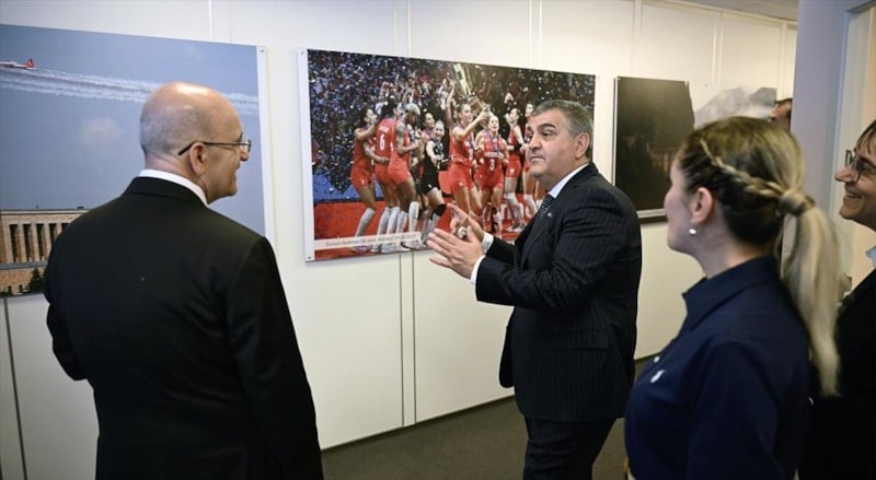 AA foto muhabirlerinin ofisin duvarlarını süsleyen fotoğraflarını inceleyen Şimşek, Brüksel ofisi habercileriyle sohbet etti.