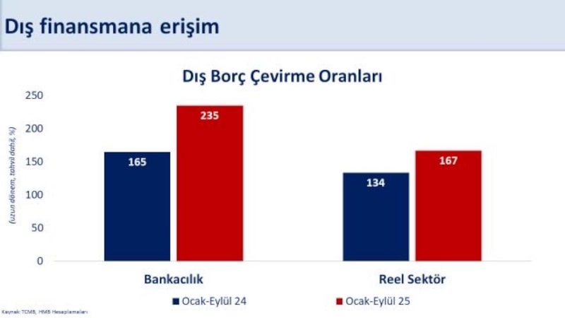 Eylülde yıllık cari açık 20,1 milyar dolar gerçekleşti. Üçüncü çeyrekte yıllık açığın milli gelire oranının yüzde 1,3 ile yatay seyretmesini bekliyoruz. Dış finansmana erişimdeki olumlu görünüm üçüncü çeyrekte de sürdü. Reel sektörün ve bankaların dış borç çevirme oranları ocak-eylül döneminde sırasıyla yüzde 167 ve yüzde 235 gerçekleşti.