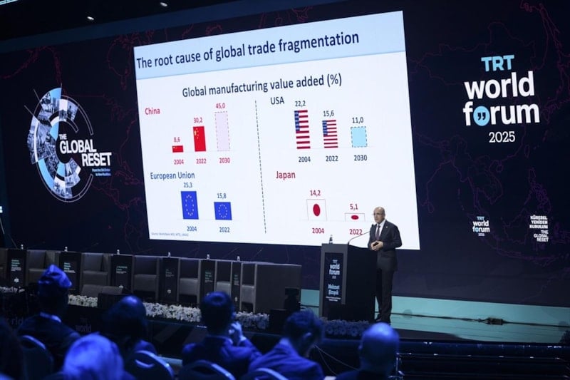 Bundan 20 yıl önce Çin'in küresel imalattaki payının yüzde 9'un altında olduğunu, bugün söz konusu oranın yüzde 30'un üzerine çıktığını kaydeden Şimşek, "Aynı eğilim devam ederse bu pay yüzde 45'e bile çıkabilir. Kim pay kaybetti? Genel olarak Batı. ABD'nin küresel imalattaki payı yüzde 22'den yüzde 11'e geriledi. Avrupa Birliği yaklaşık 10 puan kaybetti. Japonya da öyle. İşte korumacılığın asıl nedeni bu." diye konuştu.