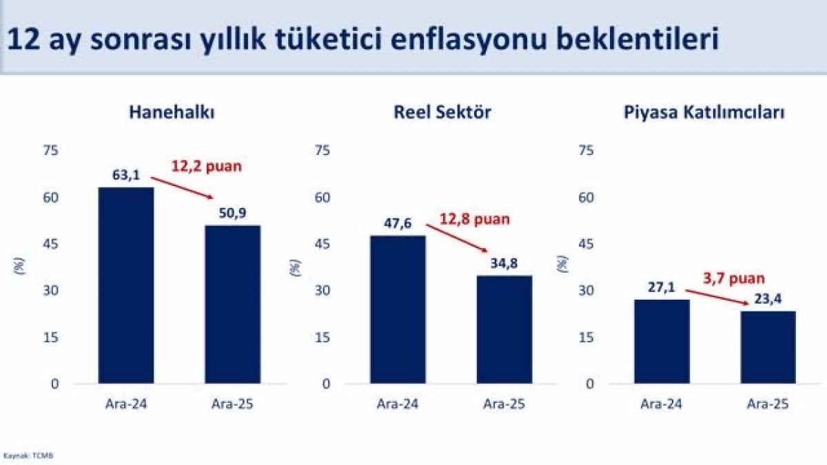 Verilere göre 2025 yılı Aralık ayında 12 ay sonrası yıllık enflasyon beklentileri, geçen aya göre piyasa katılımcıları için 0,14 puan azalarak yüzde 23,35'e, reel sektör için 0,90 puan azalışla yüzde 34,80'e, hanehalkı için 1,34 puan düşerek yüzde 50,90'a geriledi.