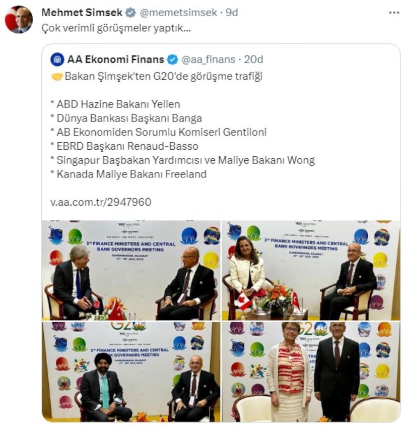 Hindistan'da düzenlenen G20 toplantılarında yoğun görüşme trafiği gerçekleştiren Hazine ve Maliye Bakanı Mehmet Şimşek, toplantılarının verimli geçtiğini duyurdu.
