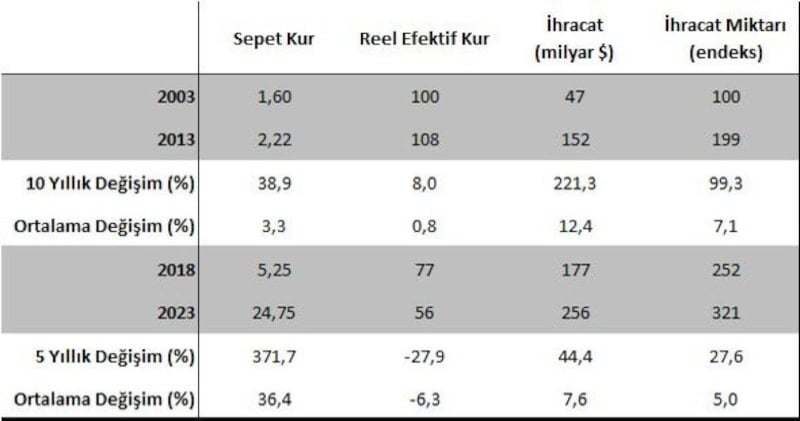 2003-13 döneminde nominal sepet kur yıllık ortalama yüzde 3,3; reel ihracatımız yüzde 7,1 artmıştır. 2018-23 döneminde ise kur yüzde 36,4 artarken, ihracatımız sadece yüzde 5 artmıştır.