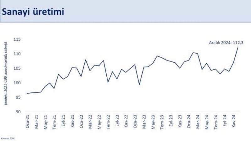 Sanayi üretim endeksi Aralık 2024'te, aylık bazda yüzde 5, yıllık bazda yüzde 7 artış gösterdi.