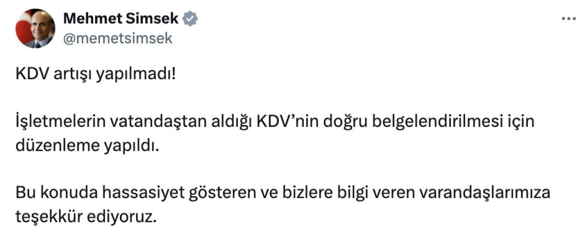 Bakan Şimşek'in sosyal medya hesabından yaptığı paylaşımda, yapılan çalışmanın bir KDV artışı olmadığını belirterek şu ifadeleri kullandı: